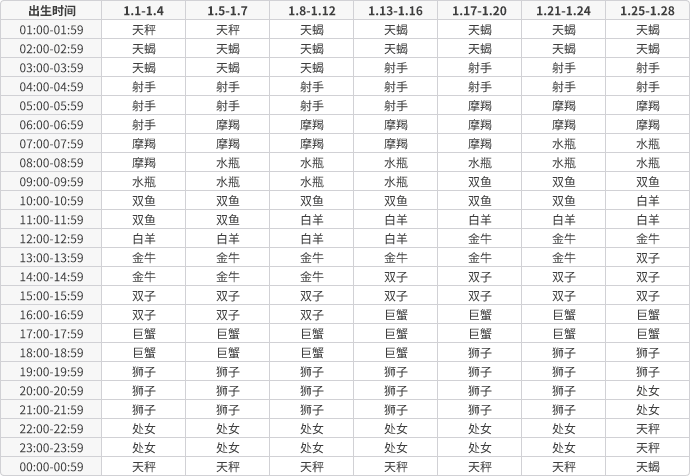 < 1月出生的十二星座上升星座查询表 >
