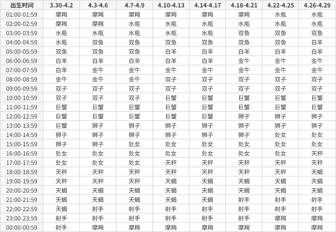 上升星座查询表