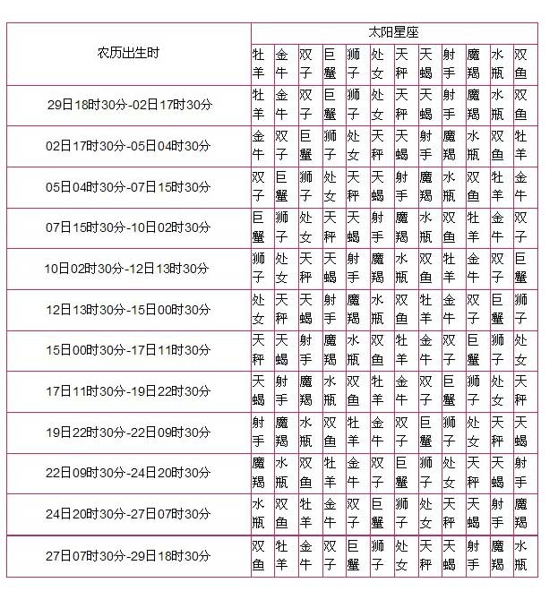 必要说明一下,表中的时间是以农历为基准,表中体现的太阳星座等同于月亮星座,请大家根据自己的出生农历时间来对照查询吧,如果你不知道自己农历出生时间可以使用农历查询工具来查询得知你的农历出生时辰。